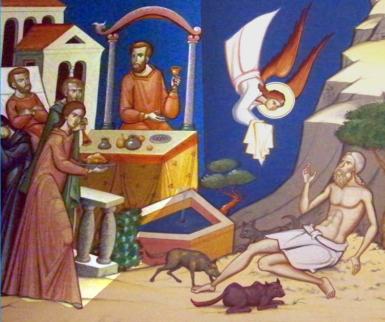 Evanghelia ne arată contrastul: bogatul îmbrăcat în porfiră și vison, trăind în desfătări, și Lazăr, un sărac plin de bube, aruncat la poarta lui.
